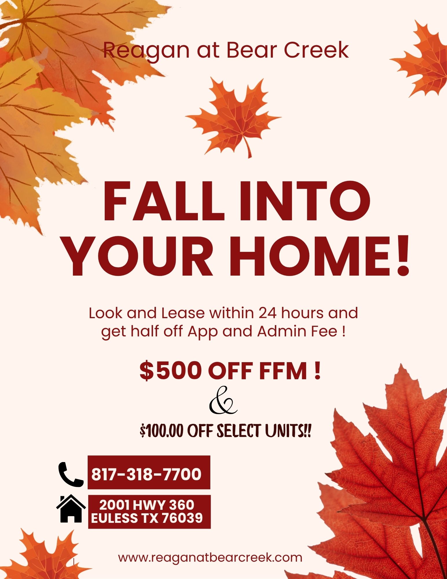 Look and lease within 24 hours and receive: ✨ 50% off your application and admin fees ✨ $500 off your first full month’s rent Bonus: Get an extra $100 off select units! Don’t miss out—this limited-time offer won’t last long!